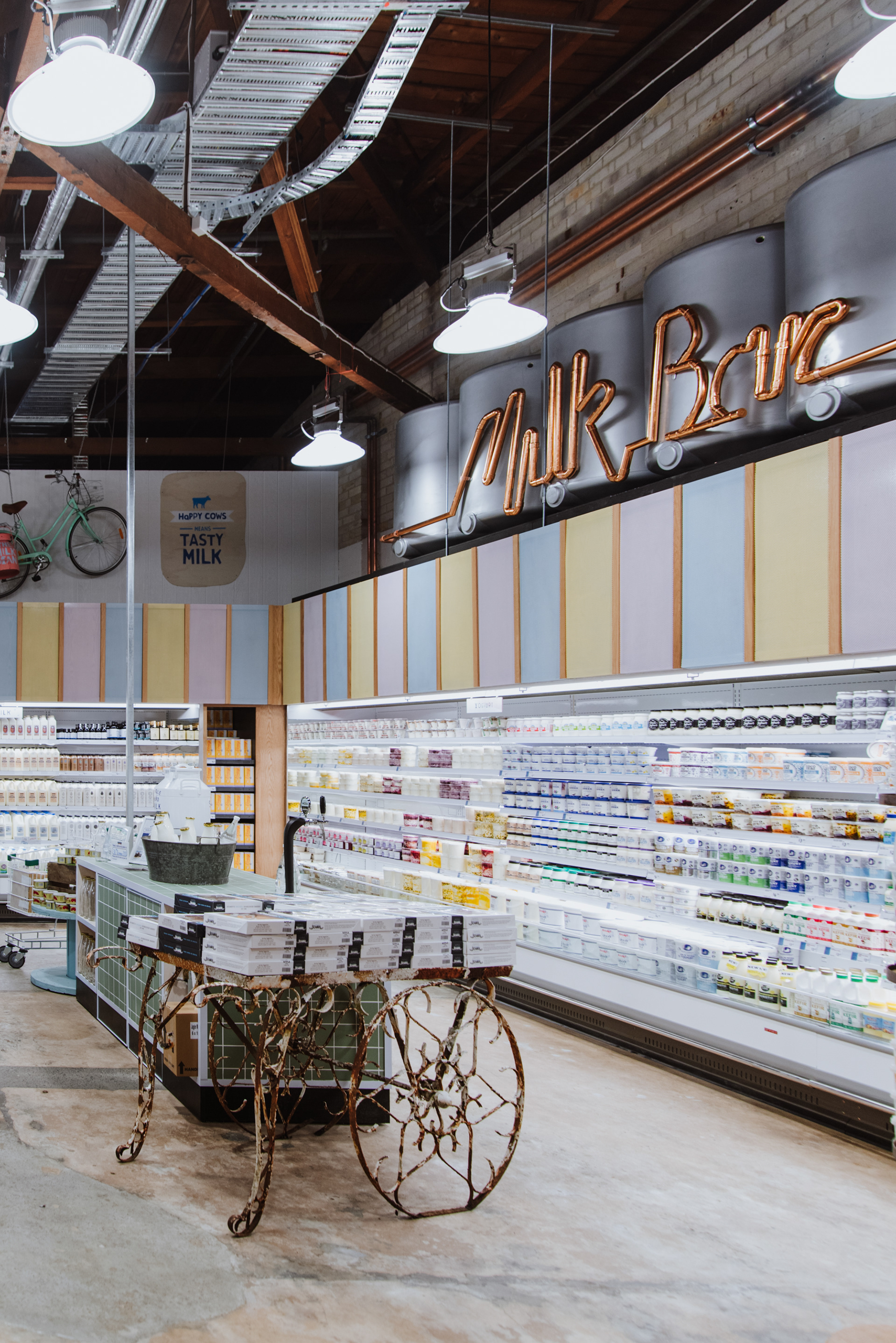 Working with Special Group Sydney, we were tasked with assisting their team to develop the interior graphics and branding for Harris Farm Markets' flagship store in Cooks Hill, Newcastle. Inspired by the rich industrial heritage of the area, we designed the store to have a mechanical feel — complete with sheet metal signage, cogs, conveyor belts and steel girder lettering.